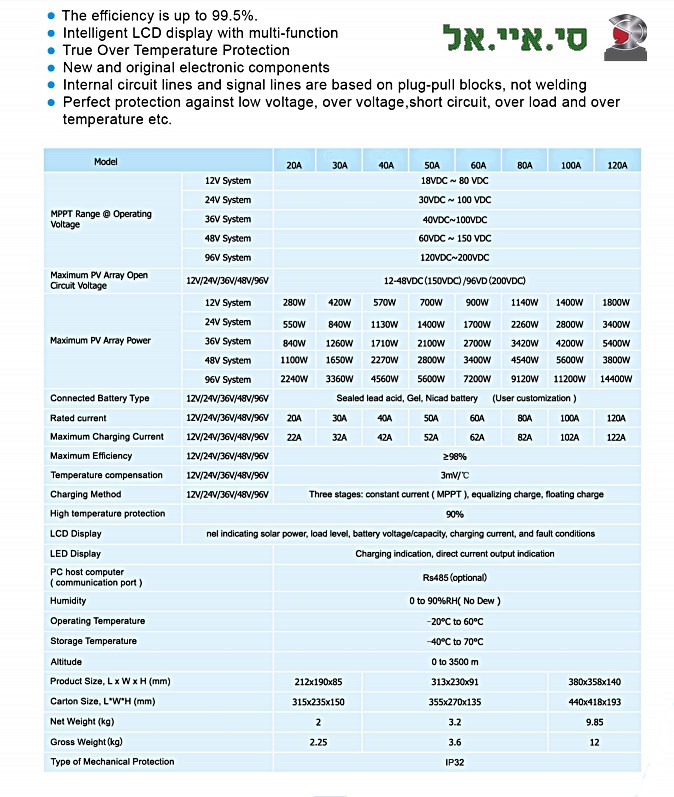 This series product adopts positive design with LCD displaying. Based on MPPT technology, which tracks the maximum power point of PV array exactly and quickly in any condition. Obtaining Max. power from solar panel anytime, increased the charging efficiency of solar panel.