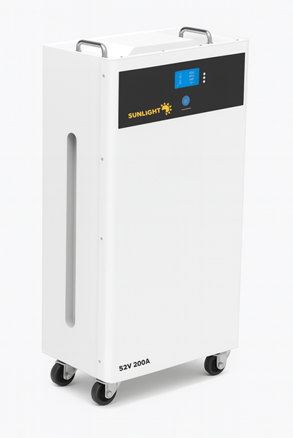 סוללת SUNLIGHT 52V 200A פותחה במיוחד עבור מערכות אגירת אנרגיה סולארית, גיבוי לארגונים ומתקני תעשייה.