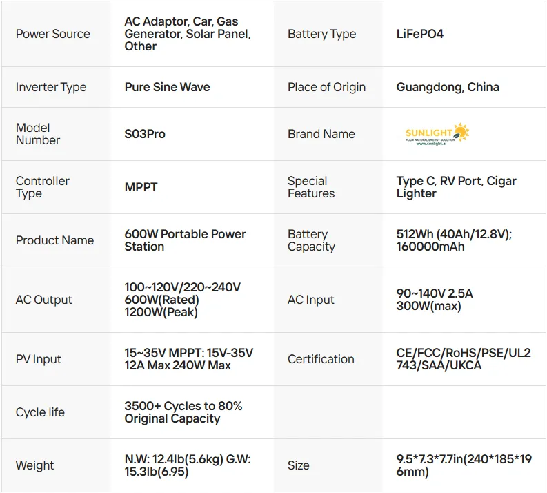 תחנת כוח ניידת SUNLIGHT ENERGY S03Pro 600W